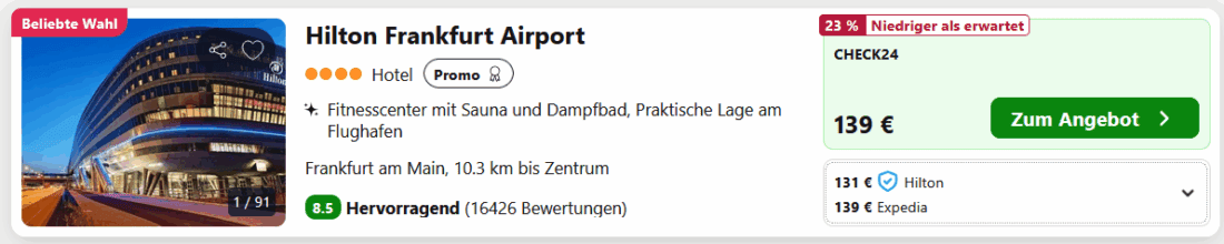 Als zweites Beispiel haben wir ein Kettenhotel gewählt, das Hilton am Frankfurter Flughafen. Gleiches Datum (20. bis 21. August 2025), aber anderer Termin. Der beste Preis laut Trivago stammt von Hilton mit 131€ für die Non-Flex-Rate oder 154€ mit Storno-Option: