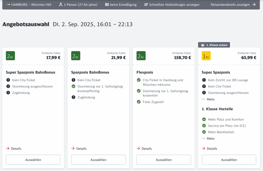 Je nachdem, welche Verbindung ihr sonst gewählt hättet, ergibt sich so eine Ersparnis zwischen 35% und 45%. Das ist natürlich nur eine Stichprobe und von vielen weiteren Faktoren abhängig. So kann der Rabatt bei stark nachgefragten Verbindungen deutlich geringer ausfallen oder in manchen Fällen gar nicht vorhanden sein.