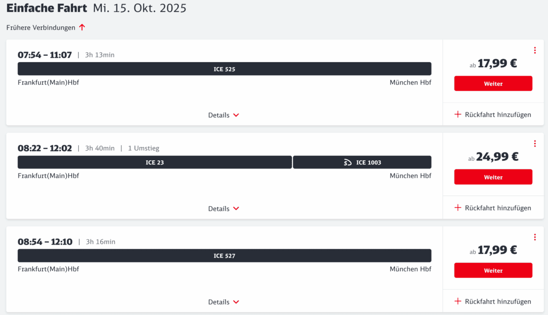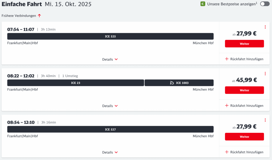 Als erstes Beispiel haben wir nach einer Fahrt von Frankfurt nach München am 15. Oktober 2025 gesucht. Normalerweise gibt es dafür etwa in den Morgenstunden die folgenden Optionen zu Preisen zwischen 27,99€ und 45,99€ im Fernverkehr: