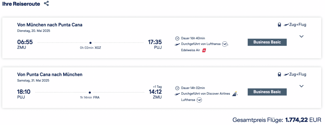 Die o.g. Meilengutschriften beziehen sich auf die Flüge von Zürich nach Punta Cana (Edelweiss) sowie von Punta Cana nach Frankfurt (Discover Airlines). Für die Bahnfahrten auf dem Hin- und Rückweg erhaltet ihr voraussichtlich insgesamt 80 weitere Statuspunkte.