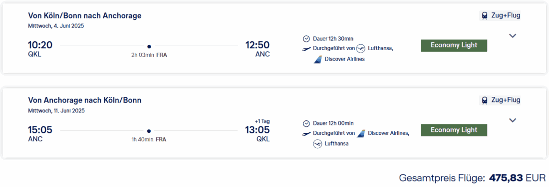 Die Lufthansa verkauft momentan wieder günstige Tickets von Deutschland nach Alaska. Die Langstrecke wird dabei zumeist von Discover Airlines durchgeführt, teilweise gibt es auch Optionen mit der Star Alliance. Ab 476€ gibt es Hin- und Rückflüge im Juni 2025. Der nächstbeste Preis wären dann ca. 520€ im September.