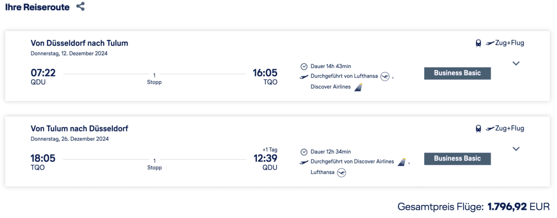 Die oben genannten Meilengutschriften beziehen sich auf den Flug von Frankfurt nach Tulum. Für die Fahrten mit der Deutschen Bahn könnt ihr voraussichtlich mit weiteren 40 Statuspunkten rechnen.