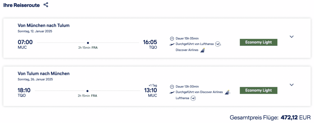 Die Tickets werden in Buchungsklasse K ausgestellt. Für einen Hin- und Rückflug von München über Frankfurt nach Tulum könnt ihr voraussichtlich folgende Meilengutschriften erwarten: