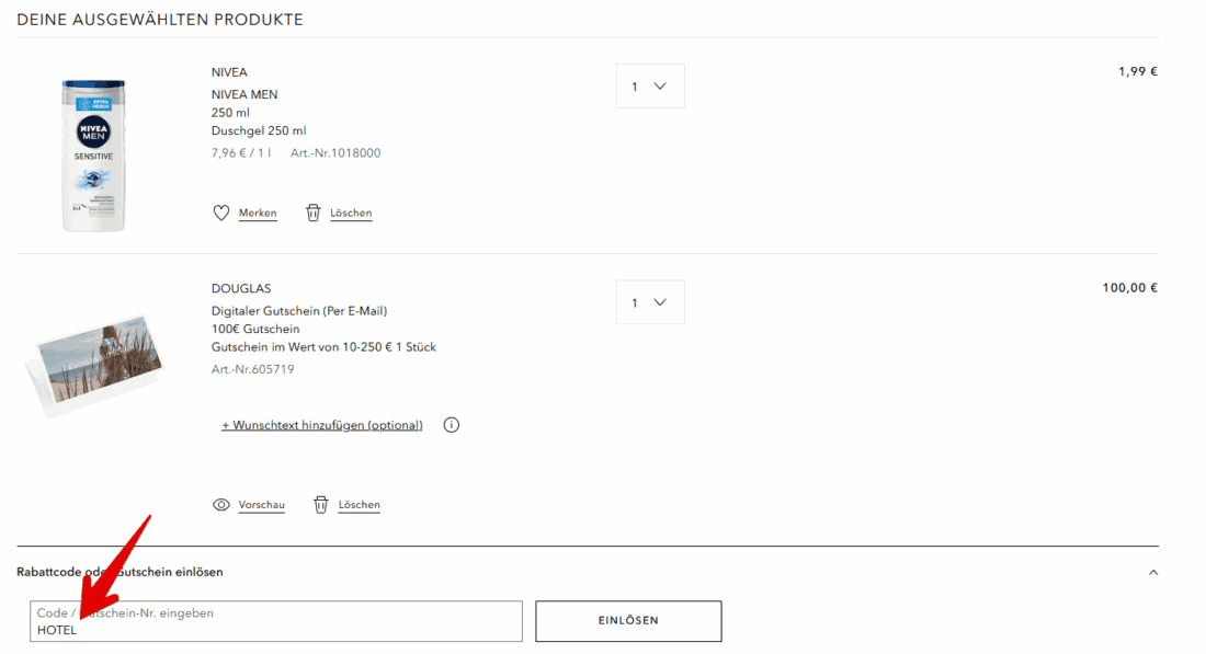 Online müsst ihr zunächst die gewünschten Artikel in den Warenkorb legen. Öffnet danach das Gutschein-Feld unter der Artikelübersicht und gebt dort den Code HOTEL ein:
