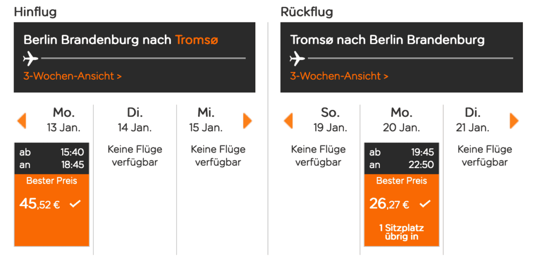 Der Flug von Berlin nach Tromsø wird nonstop in einem Airbus A320 durchgeführt. Die Sitzplätze sind in der üblichen 3-3 Konfiguration angeordnet und die Beinfreiheit beträgt im Durchschnitt nur 74 Zentimeter. Gegen Aufpreis (ab 26€ / Richtung) habt ihr die Möglichkeit, einen Sitzplatz am Notausgang mit mehr Beinfreiheit zu buchen. Die Flugdauer beträgt ca. 3 Stunden.
