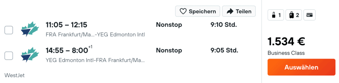 Ähnlich wie nach Calgary gibt es jetzt auch preiswerte Condor Business Class Flüge nach Edmonton im Westen Kanadas. Ihr erreicht das Ziel mit Abflug von Frankfurt ab 1.534€. Verfügbarkeiten gibt es dabei aber leider nur kurzfristig für Abflüge im August. Hin- und Rückflug erfolgen nonstop.