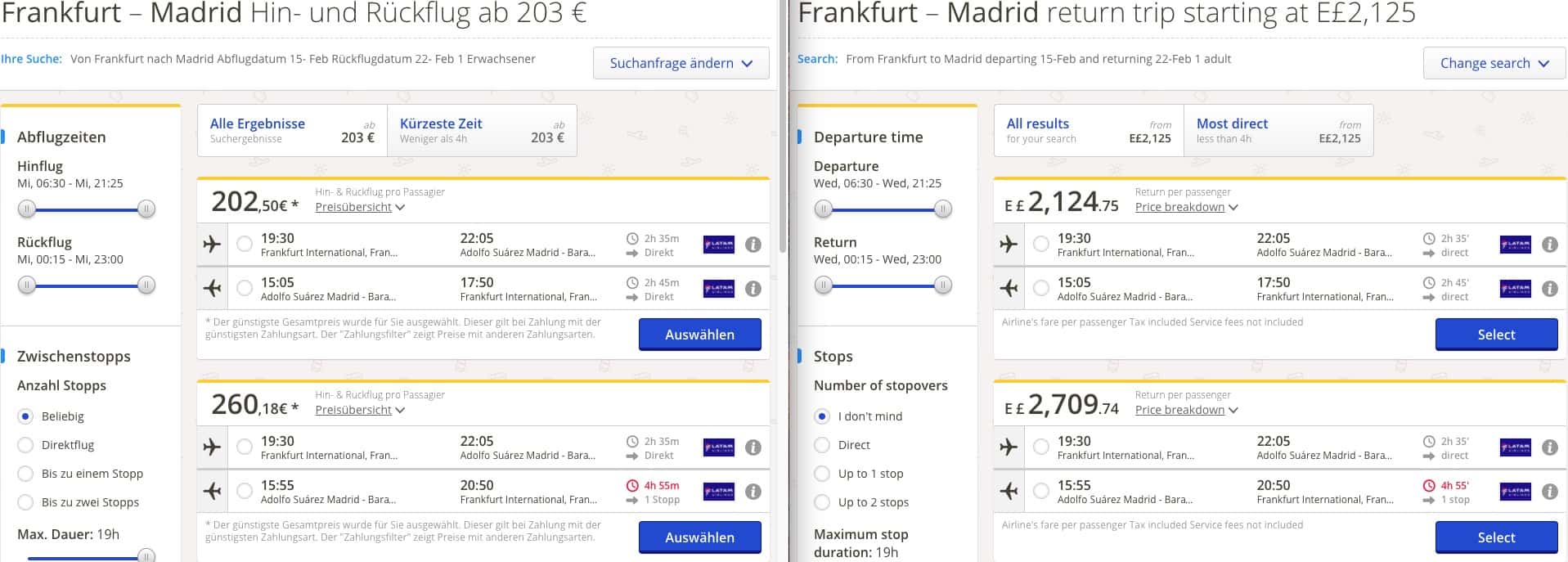 Ganz nett sind auch die Business Class-Flüge von Frankfurt/Main nach Madrid mit LATAM. Normerweise 203€ bei eDreams.de, kosten sie bei eg.eDreams.com nur umgrechnet 123€: