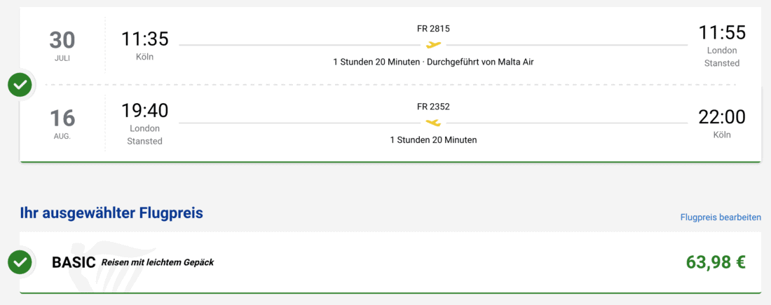 Die Kreuzfahrt startet und endet in Southampton. Da es nur sehr wenige Direktverbindungen zum lokalen Flughafen gibt, sind hier als Alternative Flüge nach London zu empfehlen. Ein Beispiel sind Flüge mit Ryanair von Köln nach London-Stansted, wobei der Hinflug am 30. Juli und der Rückflug am 16. August 2025 erfolgt. Diese Kombination ist momentan ab 64€ (zzgl. 60€ für 20 kg Aufgabegepäck) buchbar: