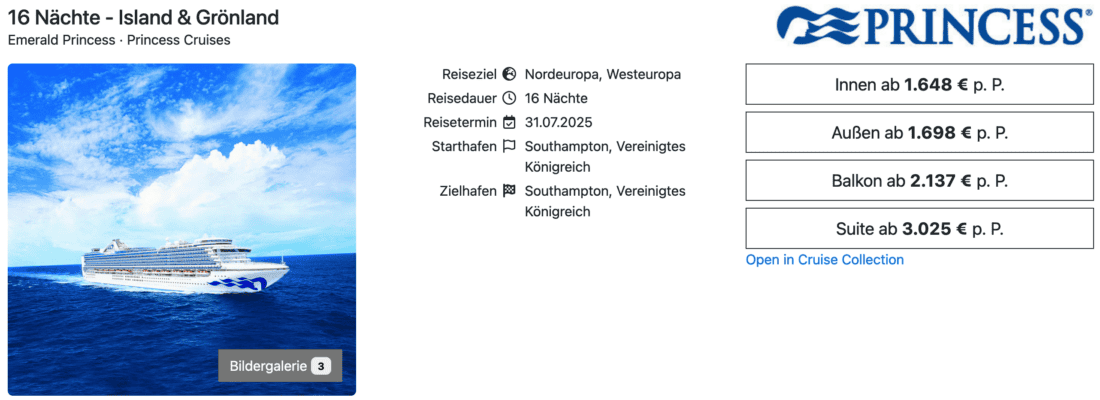 Die Emerald Princess der US-Reederei wird im Sommer 2025 für eine Kreuzfahrt ab/bis Southampton in Richtung Island und Grönland eingesetzt. Mit Abfahrt am 31. Juli 2025 fällt die Reise auch in den Zeitraum der Sommerferien in vielen Bundesländern. Für 16 Nächte in einer Innenkabine zahlt ihr aktuell 1.648€ pro Person. Weitere Optionen sind die Außenkabinen ab 1.698€ sowie die Balkonkabinen ab 2.137€ (jeweils pro Person bei Doppelbelegung).