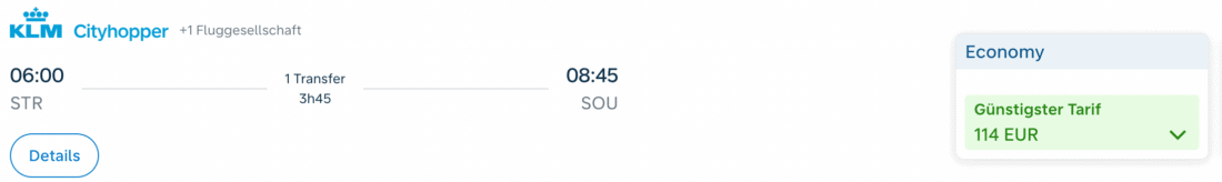 Die Kreuzfahrt startet in Southampton und endet in Fort Lauderdale. Deshalb sind für die An- und Abreise zwei Oneway-Flüge erforderlich. Für die Anreise nach Southampton könnt ihr ab Stuttgart mit KLM über Amsterdam fliegen. Dies ist am frühen Morgen des Abfahrtstages für 114€ (zzgl. 35€ für 23 kg Aufgabegepäck) möglich: