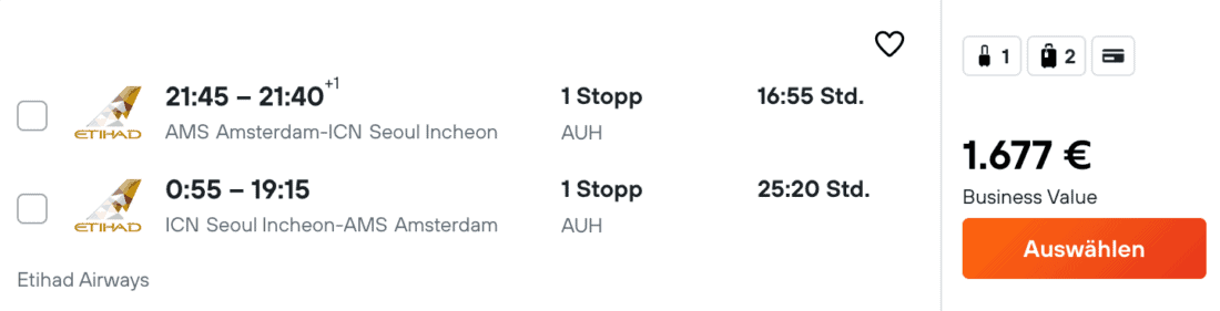 Aktuell verkauft Etihad Airways an ausgewählten Daten günstige Flüge in der Business Class von Amsterdam in die südkoreanische Hauptstadt Seoul. Tickets für den Hin- und Rückflug könnt ihr euch ab 1.677€ sichern. Verfügbarkeiten gibt es im Reisezeitraum von Juli bis August 2024.