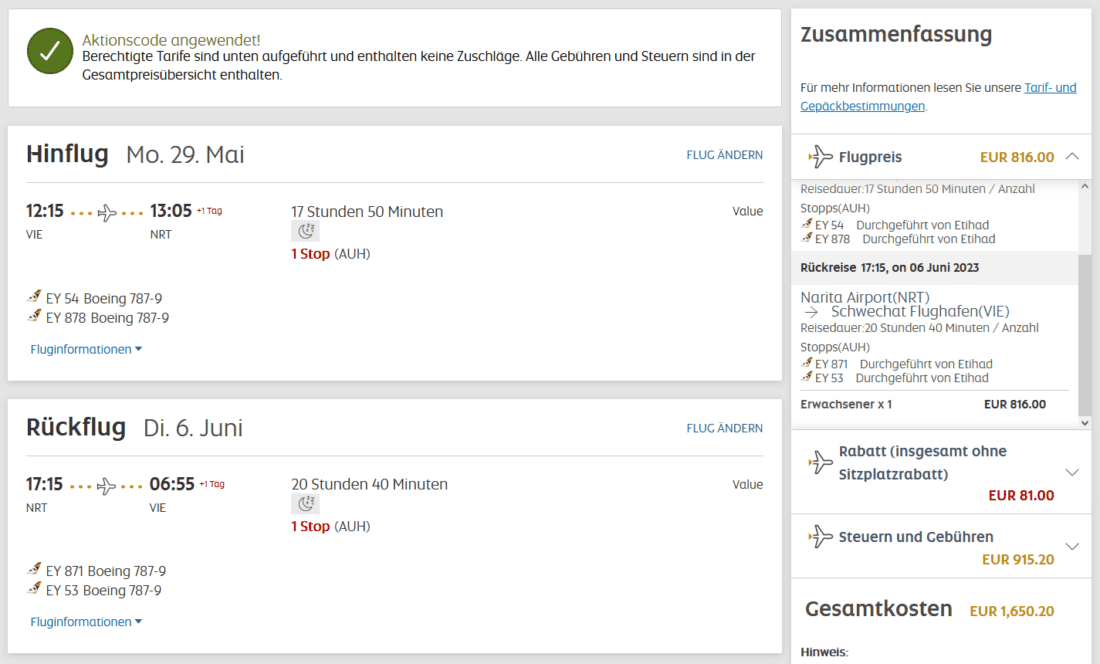 Besonders interessant ist dieses Angebot für Inhaber einer American-Express-Kreditkarte, denn mit diesem Gutschein sinkt der Preis auf 1.651€. Bucht dazu direkt auf Etihad.com und tragt im Suchformular den Rabattcode ein.