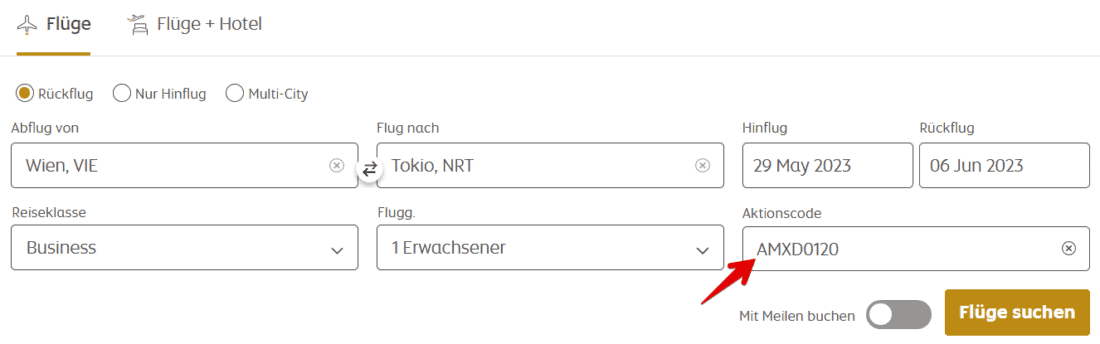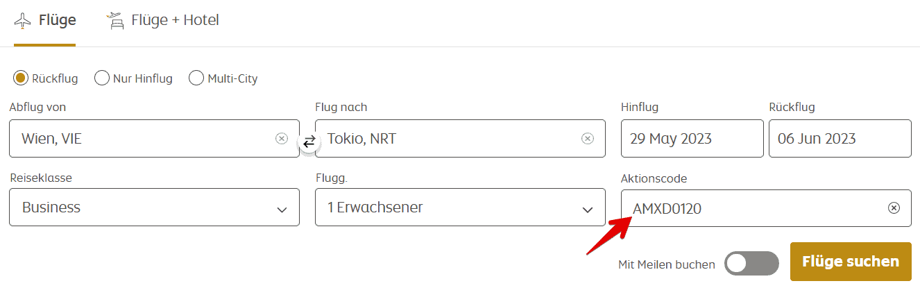 Beachtet, dass die Eingabe des Gutscheincodes auf diesem Wege nicht möglich ist. Dafür müsst ihr direkt Etihad.com aufrufen und in der Suchmaske den passenden Code eingeben: