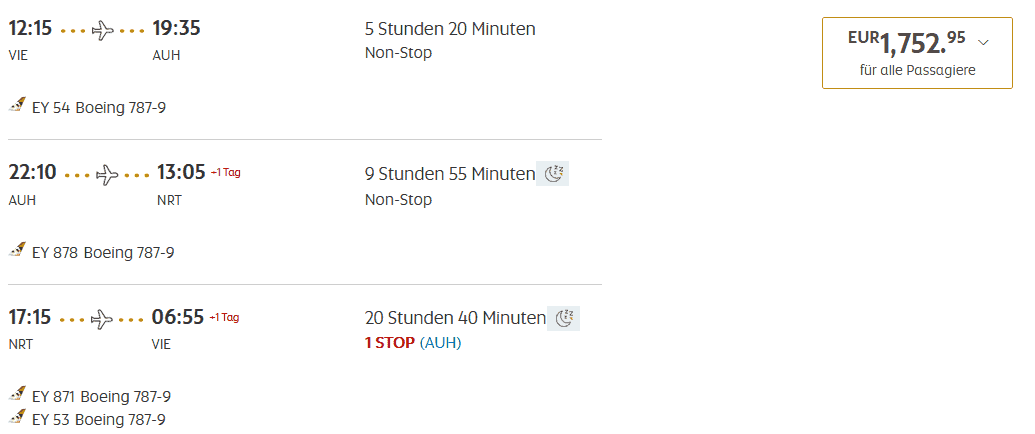 Die Flüge haben in beiden Richtungen einen Zwischenstopp in Abu Dhabi. Dort habt ihr je nach Verbindung 2 – 4 Stunden Aufenthalt. Nach aktuellem Stand erfolgen alle Flüge an Bord einer Boeing 787-9.