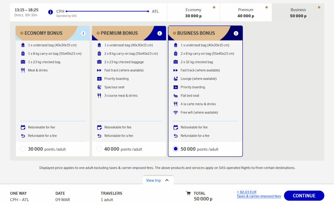Am 9. März wäre demnach ein Business Class Oneway von Kopenhagen nach Atlanta für 50.000 Meilen + 83€ Steuern erhältlich: