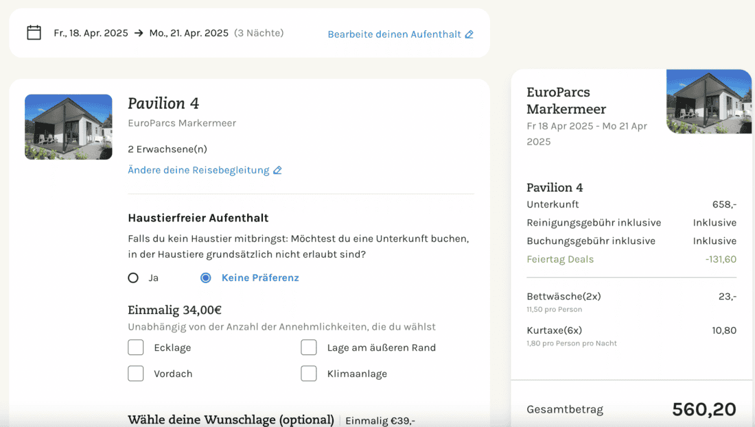 Wie immer bei solchen Angeboten lassen sich nicht durchgängig 20% Rabatt erzielen, dennoch ergeben sich gute Einsparpotenziale. Wir haben uns als Beispiel einmal den EuroParcs Markermeer für 3 Nächte von Karfreitag bis Ostermontag (18. bis 21. April 2025) angeschaut. Dort bekommt ihr die Kategorie Pavilion 4 inklusive Endreinigung, der Kurtaxe für zwei Personen und Bettwäsche für insgesamt knapp 561€. Die Ersparnis zum regulären Preis liegt demnach bei 20%, wenn man die Kurtaxe und die Pauschale für die Bettwäsche ausklammert, denn darauf gibt es keinen Rabatt.