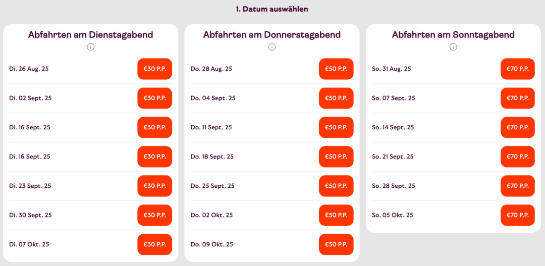 Alternativ habt ihr die Möglichkeit, euch ein eigenes Abteil zum Preis von 120€ zu buchen. Der Preis ist dann identisch und unabhängig davon, ob das Abteil von einer oder fünf Personen genutzt wird. Zur Buchung dieser Option müsst ihr auf der Landingpage den Menüpunkt Classic Privat auswählen. Dann wird euch der Gesamtpreis für das Abteil angezeigt.