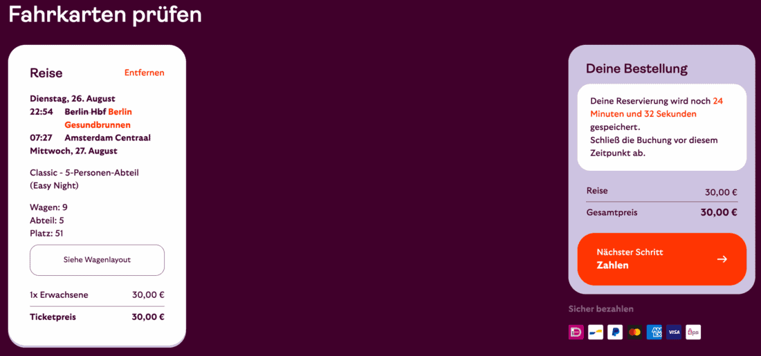 Bei der Buchung wird euch dann automatisch ein Platz im Liegewagen zugeordnet. Eine Änderung ist innerhalb des Buchungsprozesses anscheinend nicht möglich: