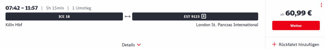 Über die Website der Deutschen Bahn lassen sich die reduzierten Eurostar-Tickets mit einem DB Super Sparpreis zur Anreise kombinieren. So gibt es dann Tickets Deutschland – London ab 61€.