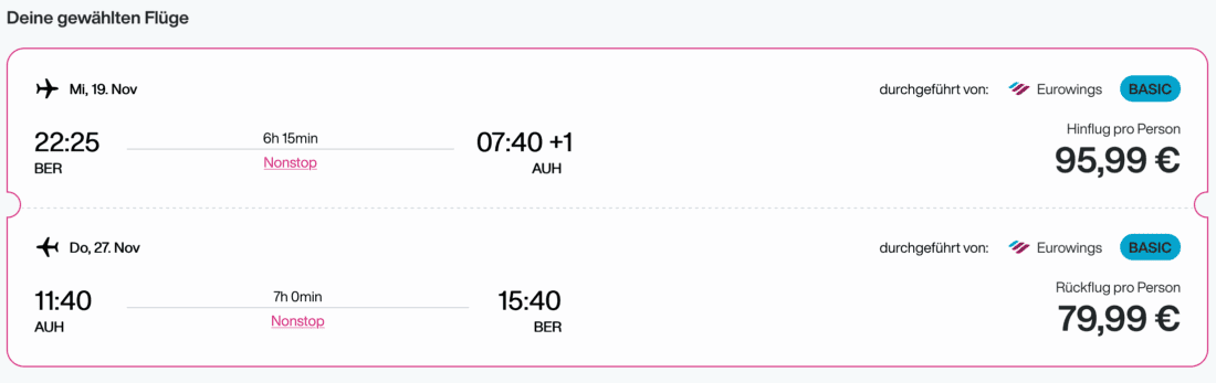 Günstige Termine findet ihr über unseren Kalender oben oder bei Google Flights. Wir empfehlen dann die Buchung direkt bei Eurowings.