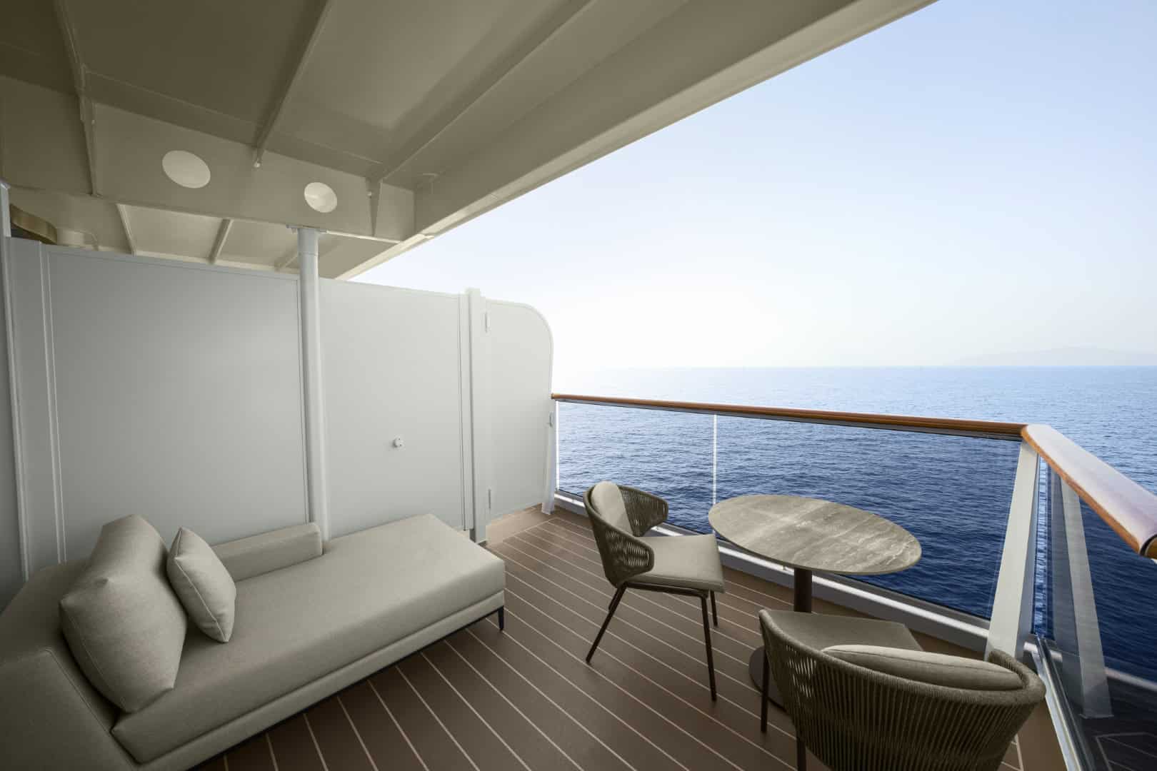 Die 461 Suiten und Residenzen mit einer Mindestgröße von 35 Quadratmetern gehören zu den geräumigsten Kabinen in der Kategorie der Luxuskreuzfahrten. Die Suiten haben deckenhohe Fenster und sind mit einem privaten Balkon ausgestattet, auf dem sich die Passagiere jederzeit entspannen können. Zu den Besonderheiten zählt außerdem ein begehbarer Kleiderschrank mit Frisiertisch.