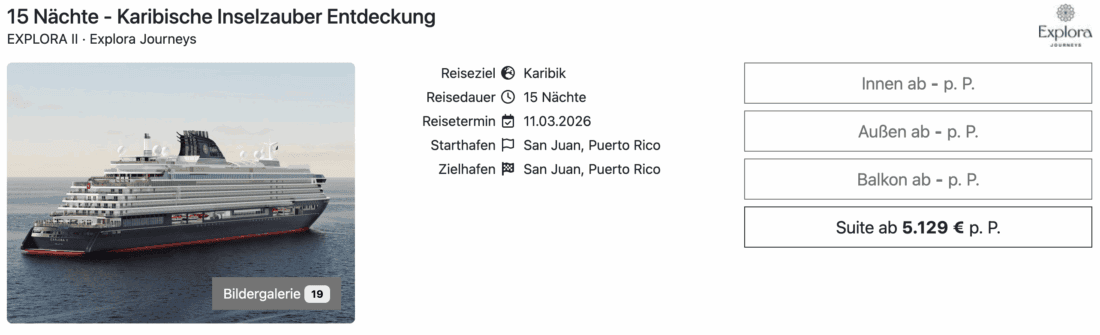 Mit der Explora II der Luxusreederei Explora Journeys könnt ihr im März 2026 zu einer abwechslungsreichen Kreuzfahrt durch die Karibik in See stechen. Die Reise startet und endet in San Juan, der Hauptstadt von Puerto Rico. 15 Nächte sind in der günstigsten Suite bereits ab 4.908€ pro Person verfügbar. Dabei handelt es sich um eine Ocean Terrace Suite in der Kategorie OT1 als Garantiekabine (Zuweisung der Suite erfolgt erst eine Woche vor Abreise).