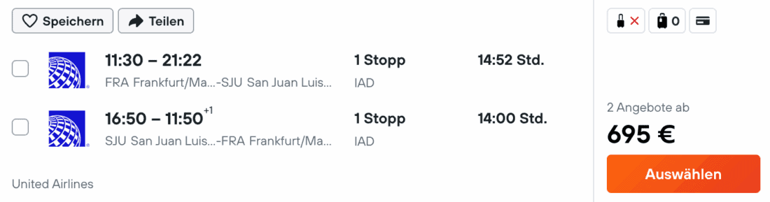 Alternativ könnt ihr die Flüge auch selbst organisieren. Ein Beispiel ist hier die Verbindung mit United Airlines mit Hinflug am 10. März und Rückflug am 27. März 2026. Diese Kombi ist ab/bis Frankfurt momentan ab 695€ (zzgl. ca. 135€ für Aufgabegepäck) buchbar: