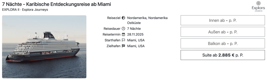 Es geht dabei Ende November 2025 mit der Explora II für eine Woche auf Kreuzfahrt in die Karibik, jeweils mit Abfahrt und Ankunft in Miami. Diese Reise ist aktuell ab 2.885€ pro Person in der günstigsten Suite buchbar. Für Alleinreisende sind Suiten ab 3.595€ verfügbar.