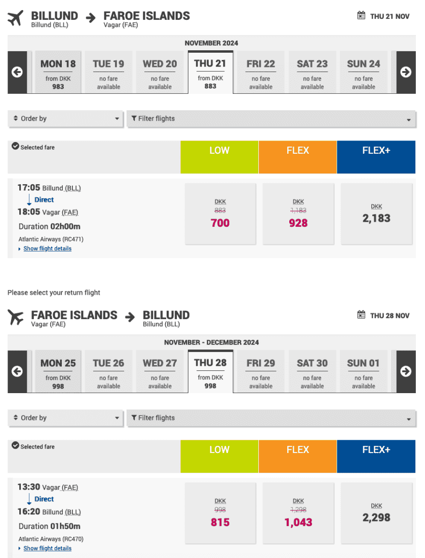 Passende Termine findet ihr in diesem Fall leider nicht mithilfe von Google Flights, da die Preise dort leider meist gar nicht oder nicht korrekt angezeigt werden. Orientiert euch daher am besten an den obigen Beispieldaten oder nutzt den Bestpreiskalender auf der Webseite von Atlantic Airways. Buchen könnt ihr anschließend ebenfalls direkt bei der Airline.