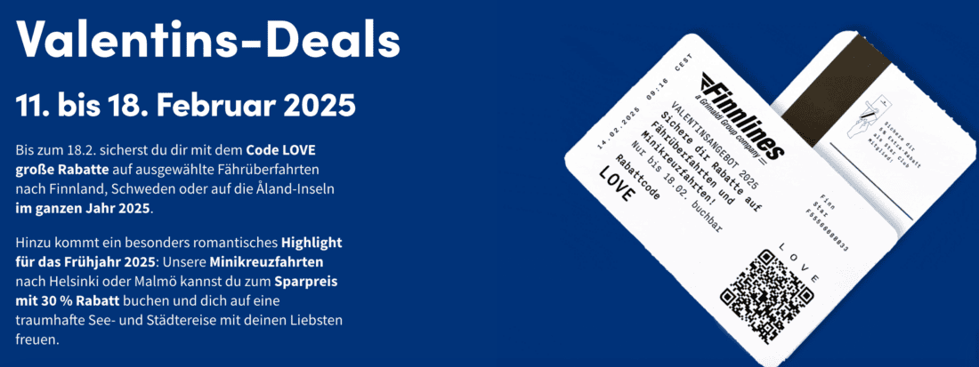 Das Angebot gilt für Buchungen bis zum 18. Februar 2025 und im Reisezeitraum bis zum 14. Dezember 2025. Finnlines wirbt auf der eigenen Webseite im Rahmen dieses Specials mit Rabatten von bis zu 50%. Die beziehen sich aber auf den teuren Standard-Tarif. Auf Basis unserer Stichproben sind verglichen mit dem nächst günstigsten Tarif maximal 20% Rabatt realistisch.