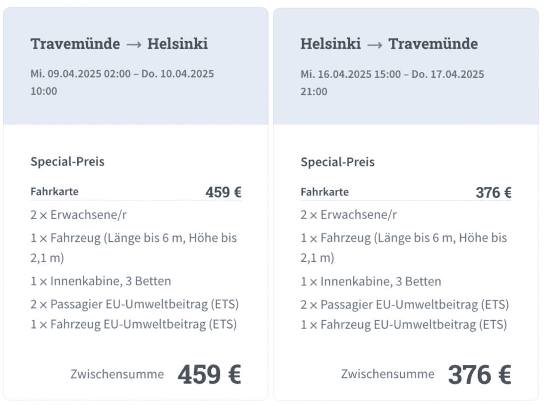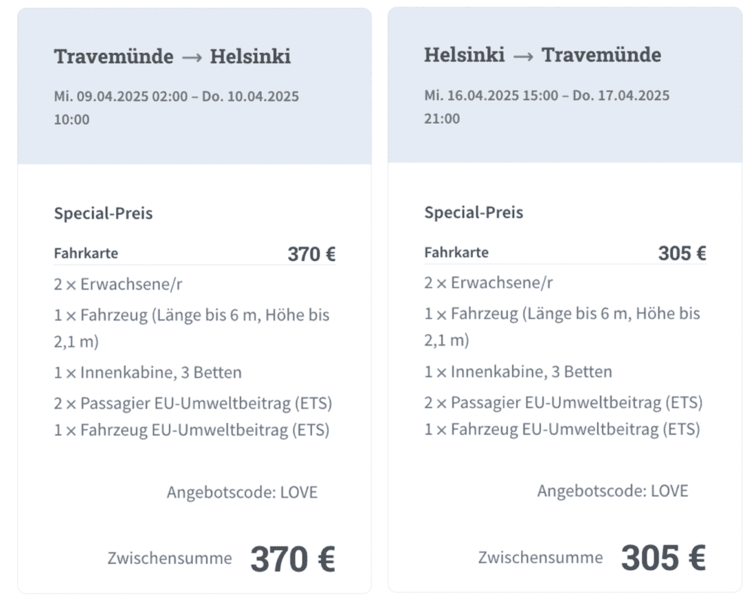 Für eine Hinfahrt am 9. und eine Rückfahrt am 16. April 2025 werden auf der Route von Travemünde nach Helsinki für 2 Erwachsene und 1 Pkw inkl. Übernachtung in einer Innenkabine im Rahmen des Angebots insgesamt 675€ fällig:
