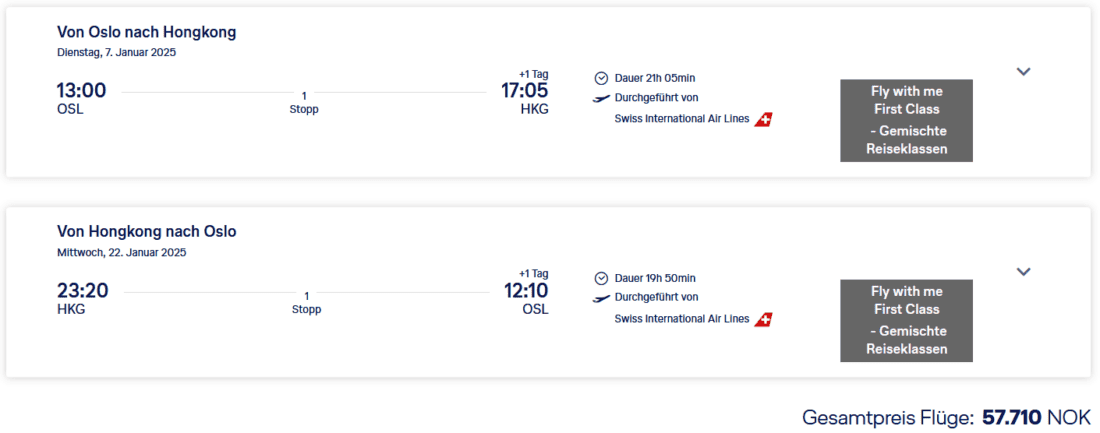 Weiterhin ziemlich gut sieht es Richtung Hongkong aus. Von Oslo aus gibt es First-Class-Flüge in die chinesische Sonderverwaltungszone ab rund 2.470€ pro Person. Geflogen wird entweder mit Swiss in der Boeing 777 oder Lufthansa im Airbus A340-600.