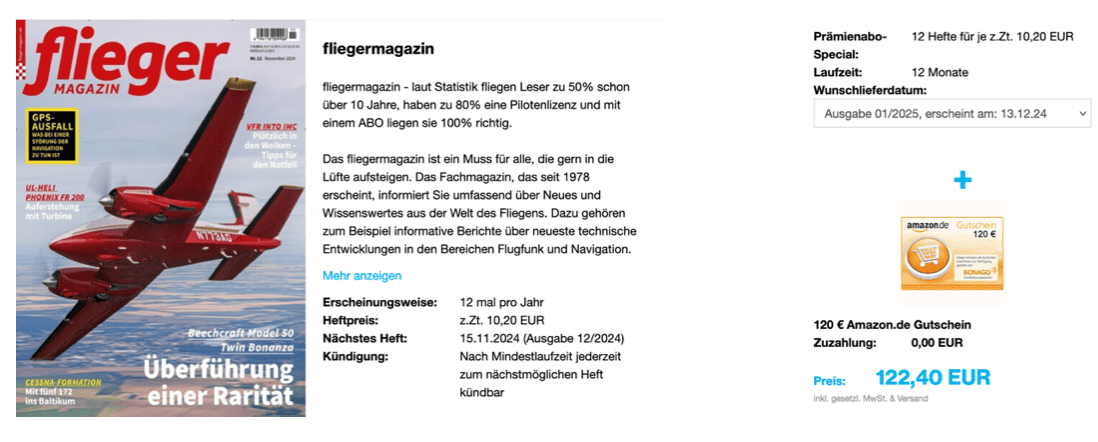 Aktuell könnt ihr euch wieder ein Jahresabo (12 Ausgaben) des Fliegermagazins für 122,40€ sichern. On top gibt es in diesem Zusammenhang einen Gutschein für Amazon im Wert von 120€ für einen Werber z.B. Frau/Mann/Freundin/Freund/Mama/Oma/Opa. Alternativ ist die identische Summe auch als Verrechnungsscheck möglich, falls euch diese Variante mehr entgegenkommt.