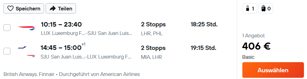 Buchungsklasse ist B für Flüge mit American und O bei den übrigen Airlines. Für das Beispiel aus dem Screenshot oben (mit SJU - MIA - LHR