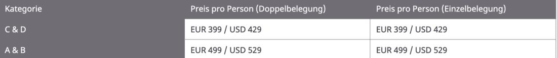 Für Alleinreisende gibt es gute Nachrichten, denn die Einzelbelegung ist in allen Kategorien ohne Zuschlag buchbar. Dies ist bei Kreuzfahrten eine echte Seltenheit. Die genannten Preise beinhalten neben allen Mahlzeiten an Bord auch ein umfangreiches Getränkepaket (Hausweine, Biere, Spirituosen, alkoholfreie Getränke, Kaffeespezialitäten, Softdrinks und Säfte). Des Weiteren sind der Zugang zum Fitnesscenter, Wellnessbereich und E-Bikes sowie ein unbegrenzter Internetzugang inkludiert.
