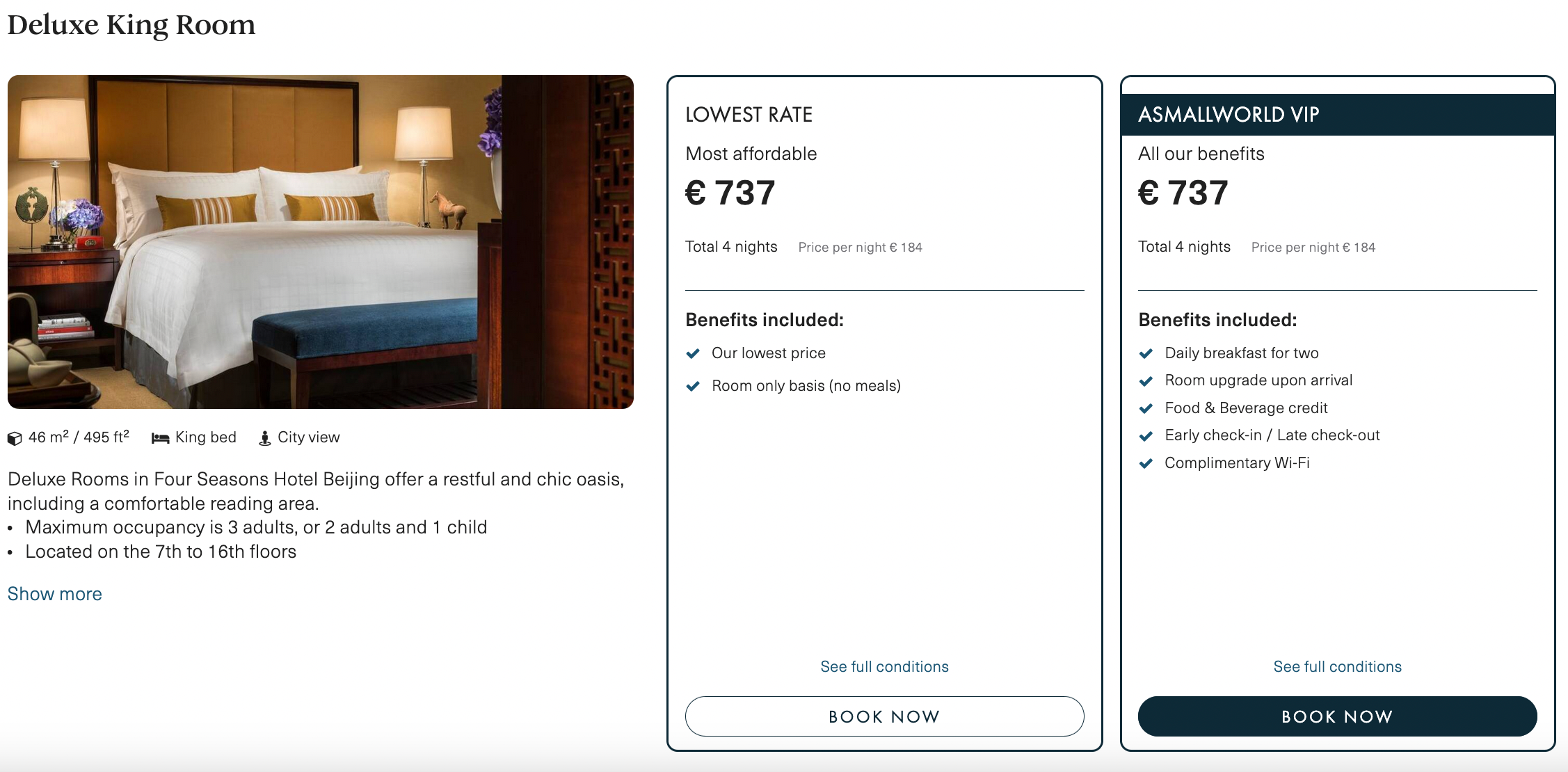 Für 4 Nächte in einem Deluxe King Room zahlt ihr bei Buchung über ASmallWorld im Beispielzeitraum vom 12. bis 16. Juni 2025 aktuell 773€: