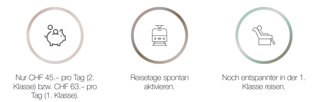 Der Preis von 450 Franken gilt für die zweite Klasse. Alternativ ist das Ganze für 630 Franken (d.h. 63 CHF / Tag) auch in der 1. Klasse erhältlich. Ihr benötigt einen SwissPass (Schweizer ID-Karte für den öV, Ausstellung kostenlos) und am Reisetag ein gültiges Halbtax.