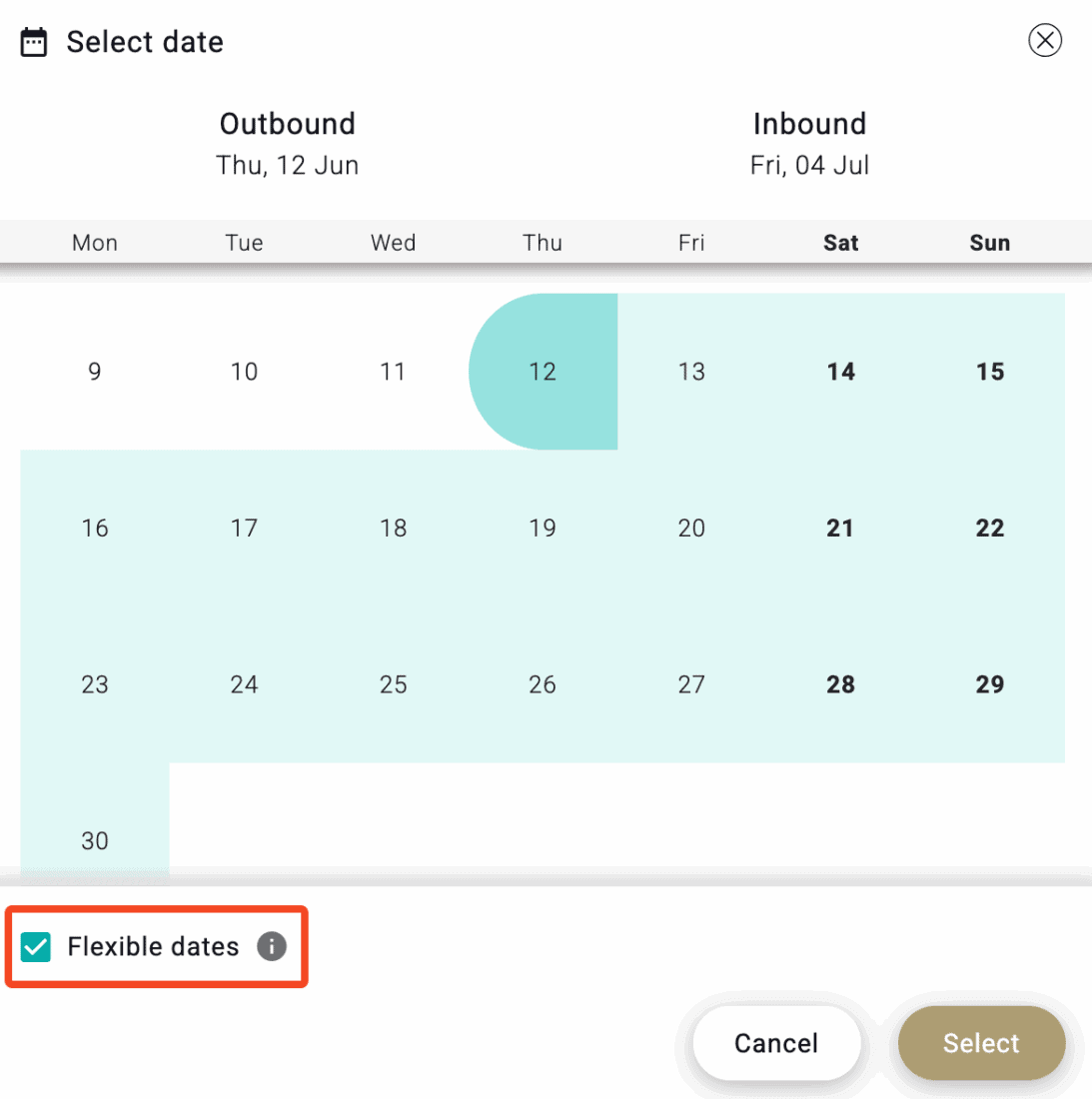 Mit der Option „Flexible dates“ sind noch Verfügbarkeiten z.B. am 17. und 19.06. zu finden.