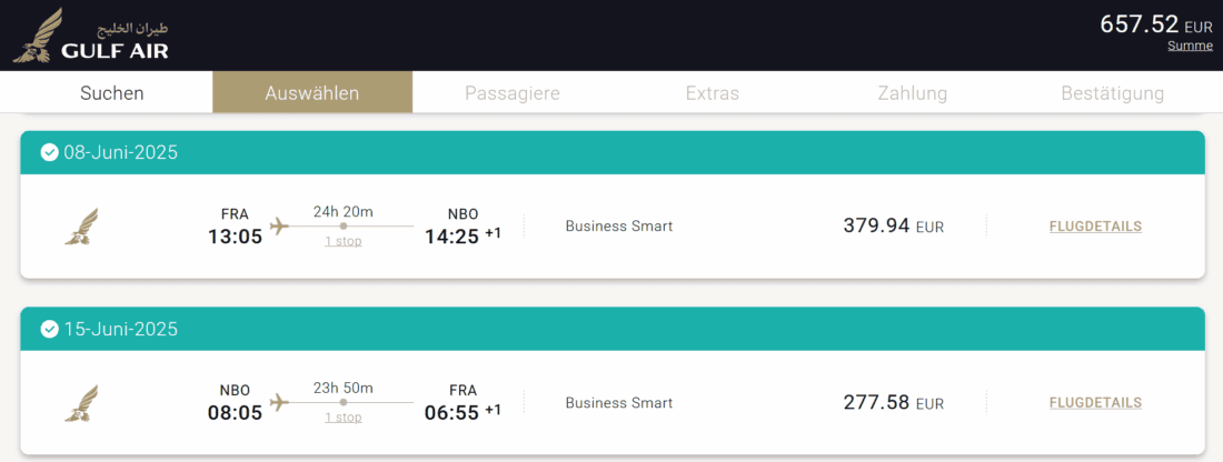 Wie eingangs erwähnt, gibt es nur Verfügbarkeiten für Juni 2025. Einige Termine (mit Übernachtung in Bahrain) lassen sich nur per Multistop-Suche finden, andere auch so. Folgendes Formular kann euch zur Buchung direkt bei Gulf Air oder alternativ über Skyscanner weiterleiten lassen: