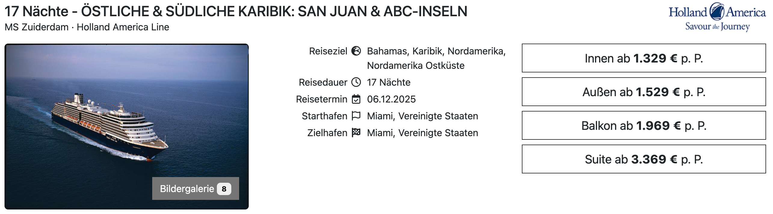 Im Dezember 2025 (Abfahrt 6. Dezember) macht sich die Zuiderdam von Miami auf den Weg in die Karibik. Insgesamt ist das Schiff 18 Tage unterwegs und besucht dabei unter anderem die Bahamas und die ABC-Inseln. Aktuell bekommt eine Innenkabine ab 1.329€ pro Person. Weitere Optionen sind die Außenkabinen ab 1.529€ sowie Balkonkabinen ab 1.969€ (jeweils pro Person bei Doppelbelegung). Alleinreisende sind ab 2.257€ dabei. Vollpension ist inklusive.