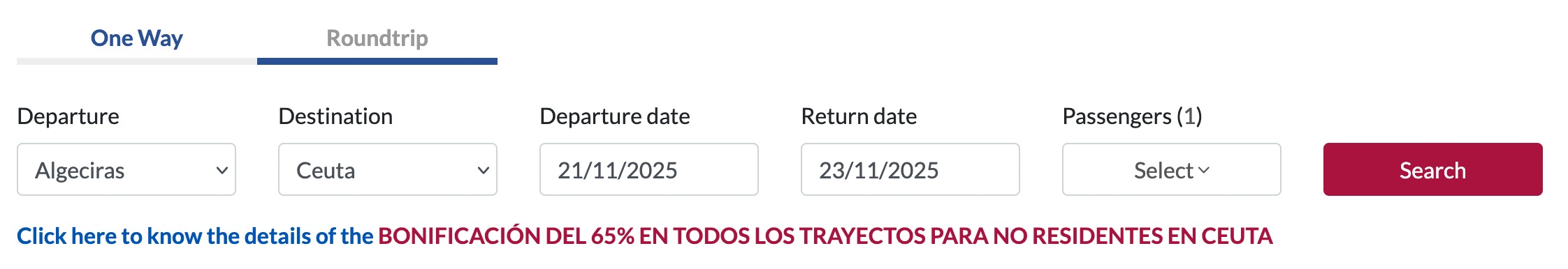 Um die Flüge zu buchen, ruft zunächst die Website von Hélity auf. Diese steht auch auf Englisch zur Verfügung (mit teils spanischen Warnhinweisen). Ihr findet dort eine Suchmaske, wie von anderen Airlines bekannt. Wichtig ist, dass ihr direkt nach einem Hin- und Rückflug sucht. Oneway-Flüge sind nicht reduziert, sodass leider auch ein Gabelflug (z.B. Algericas – Ceuta – Málaga) nicht möglich ist.