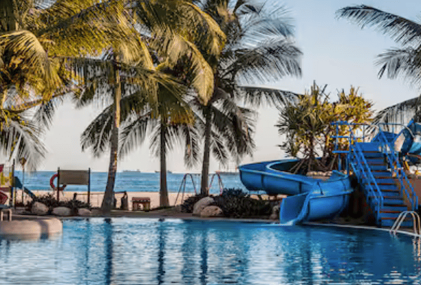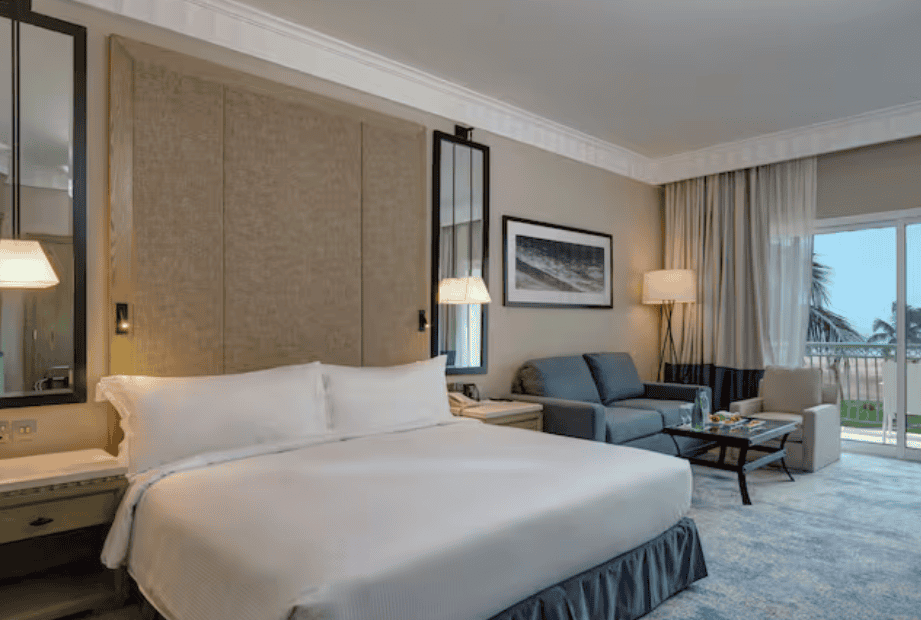 Das Hilton Salalah (4,2/5 bei Google) befindet sich im Süden des Oman mit Blick auf den Indischen Ozean etwa 10 Kilometer von Salalah entfernt. Die Transferzeit vom / zum Flughafen wird mit rund 15 Minuten angegeben. Falls ihr die Umgebung per Mietwagen erkunden wollt, gibt es nahe des Hotels noch einen Verleih, den ihr fußläufig in ein paar Minuten erreicht.