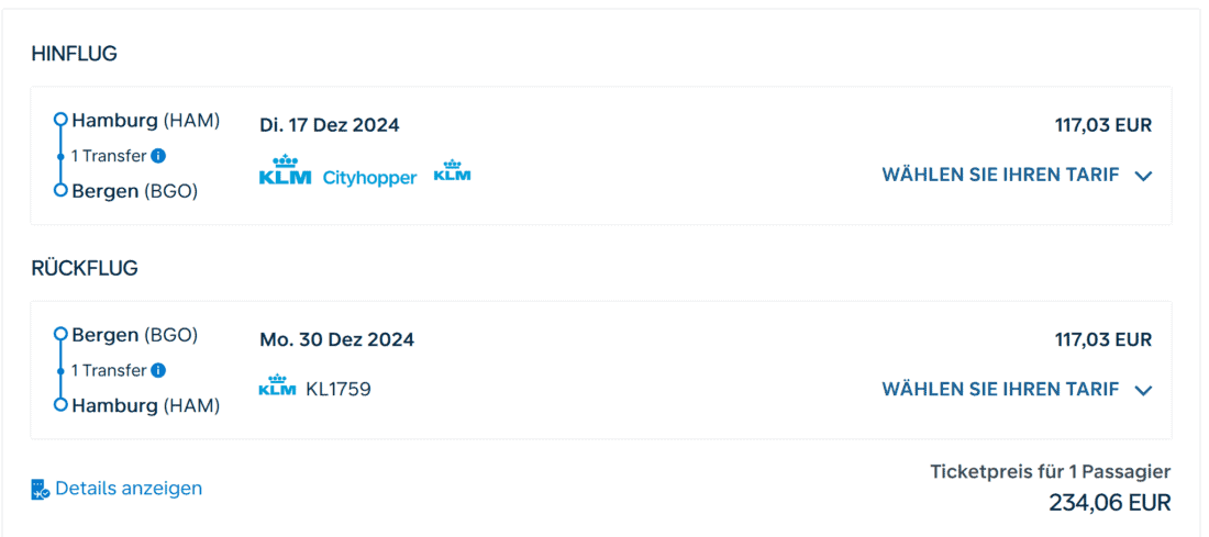 Deshalb empfehlen wir, die Anreise selbst zu organisieren. Am Beispiel Hamburg konnten wir für die Reise am 18. Dezember Flüge für 165€ mit KLM finden (234€ mit Gepäck). Die Anreise am Vortag ist zu empfehlen. Es bietet sich dabei die Gelegenheit, noch Bergen anschauen zu können.