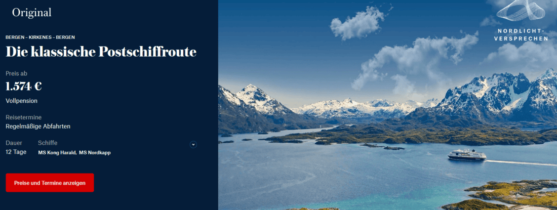 Derzeit könnt ihr die beliebten Hurtigruten an Norwegens Küste günstig für die Wintermonate buchen. Die Preise bei der Reederei beginnen ohne Flug ab 1.574€ pro Person. Dies ist für 11 Nächte auf den Hurtigruten preiswert. Infos zur Anreise haben wir weiter unten zusammengestellt.