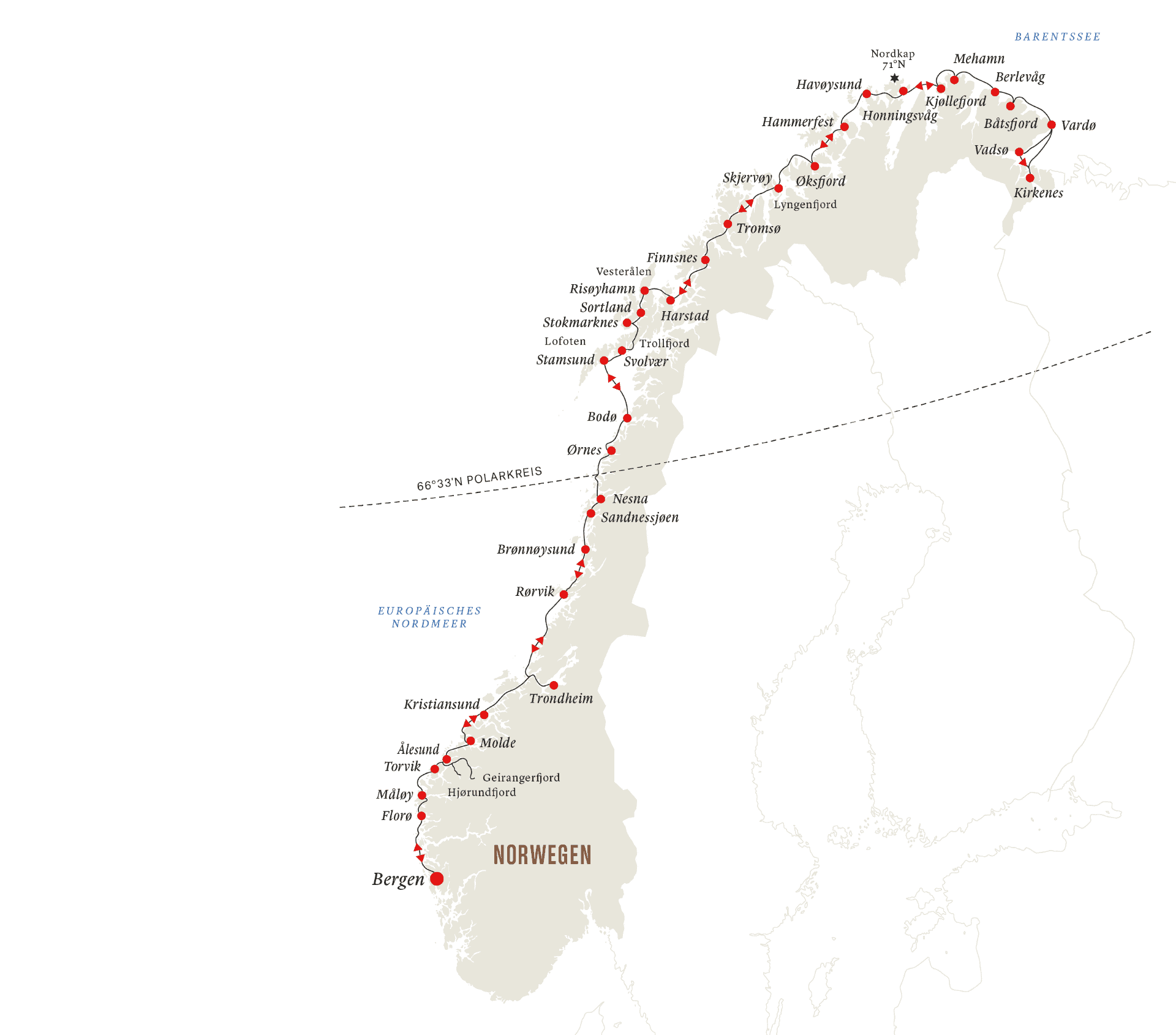 Eure Schiffsreise beginnt im Hafen von Bergen, den ihr abends verlasst. Da das Schiff jeden Tag an zahlreichen Häfen zum Passagierwechsel kurz stoppt, werden hier nur das Hauptziel des jeweiligen Tages genannt. Am zweiten Tag erreicht ihr Ålesund, dass ihr etwa 10 Stunden lang erkunden könnt. Schön ist hier der kleine Hafen, die Jugendstilgebäude und die Aussicht vom in der Stadt gelegenen Berg. Am 3. Tag fahrt ihr nach einem nächtlichen Stopp in Kristiansund nach Trondheim weiter, wo ihr 3 Stunden anlegt. Es geht weiter Richtung Norden und einem kurzen Halt in Rørvik um 21:40 Uhr. Den 4. Tag verbringt ihr weitestgehend auf See und habt nur kurze Stopps über den Tag verteilt. Der Längste ist Bodø von 13:05 Uhr bis 15:20 Uhr. Gegen Abend bewegt ihr euch im Schutz der vorgelagerten Inseln, was vor allem bei stärkerem Wind angenehm ist.