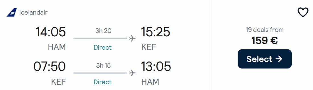 Passende Termine findet ihr schnell & einfach mithilfe von Google Flights (Anleitung). Wir empfehlen dann die Buchung direkt bei Icelandair ab 179€. Über Skyscanner bzw. Kayak sind bei Tarifen ohne Gepäck noch bis zu 20€ Rabatt drin.
