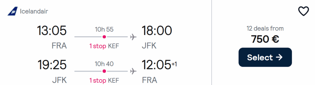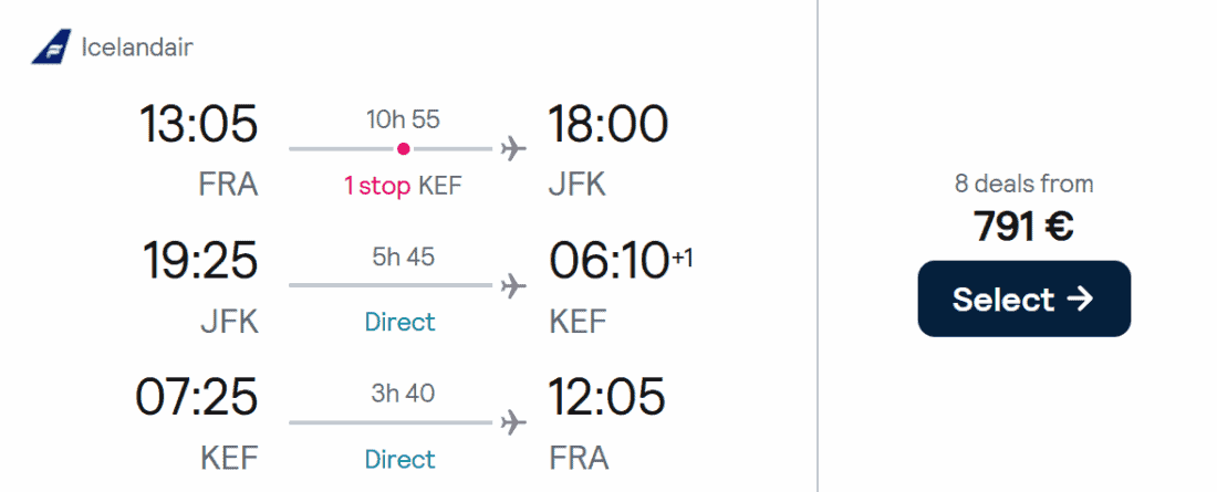 Ihr fliegt zunächst mit Icelandair zu ihrem Hub in Keflavik. Die Flugzeit beträgt auf dieser Teilstrecke rund 3 bis 4 Stunden. Der Anschlussflug von Island nach Nordamerika dauert dann nochmals rund 6 bis 8 Stunden (zurück etwas schneller).
