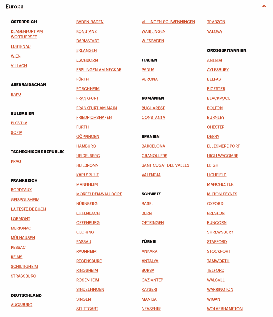 Dort findet ihr auch alle Städte aufgelistet, in denen das Angebot gültig ist. Für die vollständige Liste müsst ihr weiter nach unten scrollen, bis zum Abschnitt Entdecken Sie weitere Reiseziel-Angebote. In Europa sind das:
