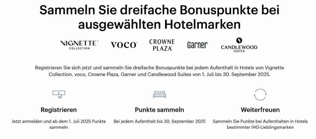 Von IHG One Rewards gibt es diesen Sommer ein weiteres Sonderangebot. Damit winken vom 1. Juli bis 30. September 2025 dreifache Bonuspunkte bei ausgewählten Hotelmarken. Die teilnehmenden Marken sind Candlewood Suites, Crowne Plaza, Garner Hotels, Vignette Collection und Voco.