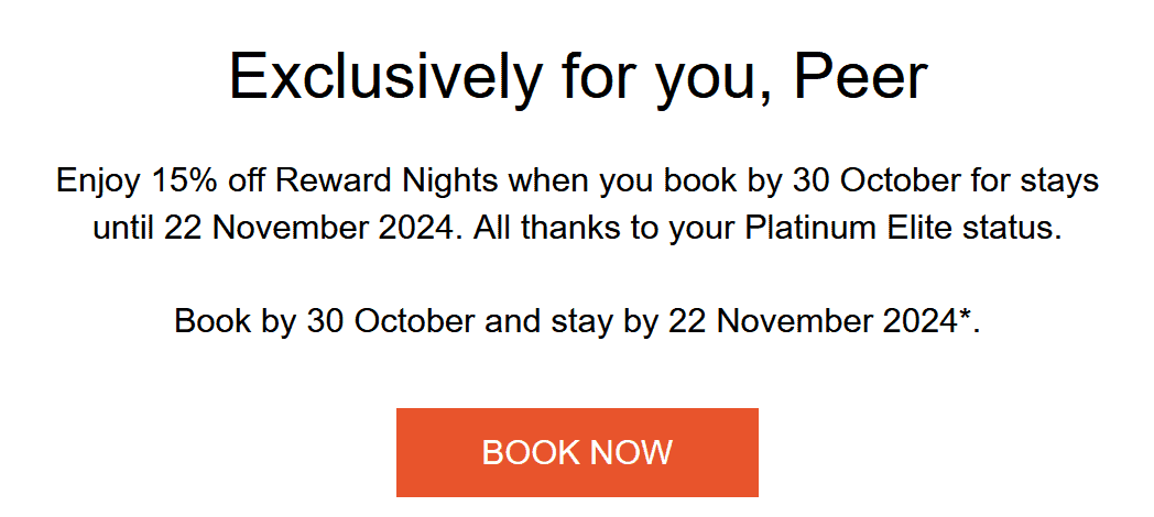 Ab sofort gibt es wieder eine solche Aktion. Statuskunden ab Platinum und aufwärts können 15% Rabatt auf alle Prämiennächte erhalten. Das Angebot gilt bis 30. Oktober 2024. Der Reisezeitraum ist allerdings sehr kurz gehalten und geht nur bis 22. November 2024.